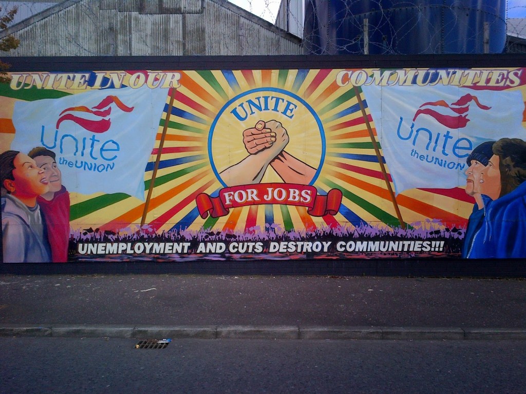 The gable wall of the Irish Congress of Trade Unions (ICTU) office in Donegall Street Place, Belfast is adorned with a magnificent mural celebrating the many unions with membership in Ireland, north and south.