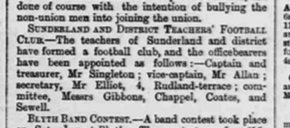 The Sunderland Echo of 27 September 1880 announces that teachers have formed a football club two days earlier on 25 September 1880. The teachers’ association was a trade union and this makes Sunderland the only senior football club to have been formed by a trade union. When the teachers were unable to get sufficient teachers to play the game they widened out their search and formed Sunderland Association Football Club on 16 October 1880.