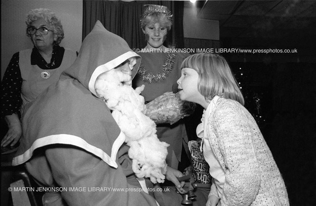 John Taylor, SOGAT London Machine Branch, is Father Christmas at the kids party they held for striking miner’s children. South Kirkby. 07/12/1984.